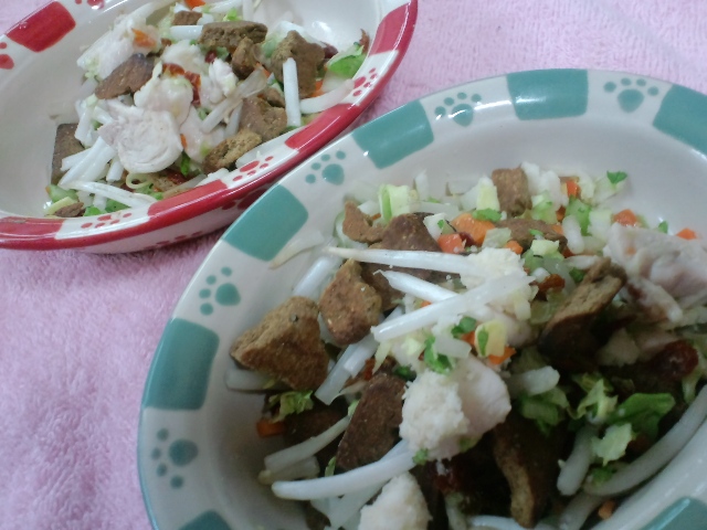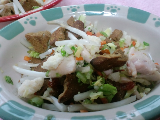 鶏肉・おから・大根の葉・きゃべつ・もやし・にんじん・ローズヒップにドライフード。