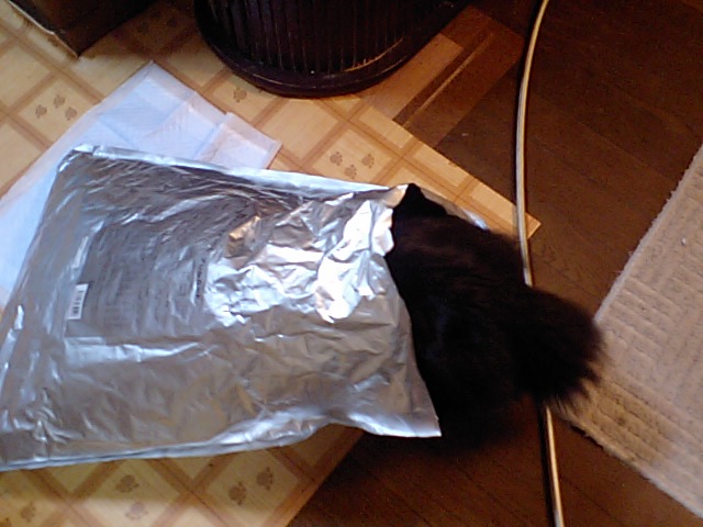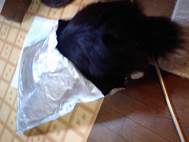 今回も空になったフードの袋に潜りこむメル